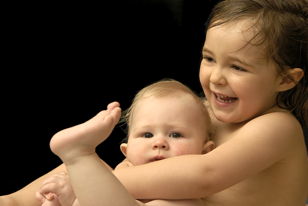 In the bath with her little sister